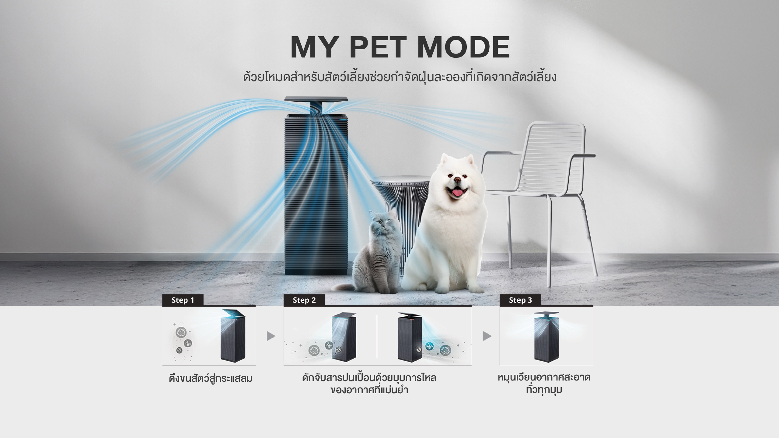 มี Pet Filter ที่ช่วยดักจับขนและฝุ่นละอองจากสัตว์เลี้ยง มาพร้อม My Pet Mode ที่ออกแบบมาเพื่อช่วยกำจัดกลิ่นรุนแรงของไฮโดรเจนซัลไฟด์ (สาเหตุของกลิ่นอุจจาระ/กลิ่นไม่พึงประสงค์จากสัตว์เลี้ยง) ได้อย่างมีประสิทธิภาพ