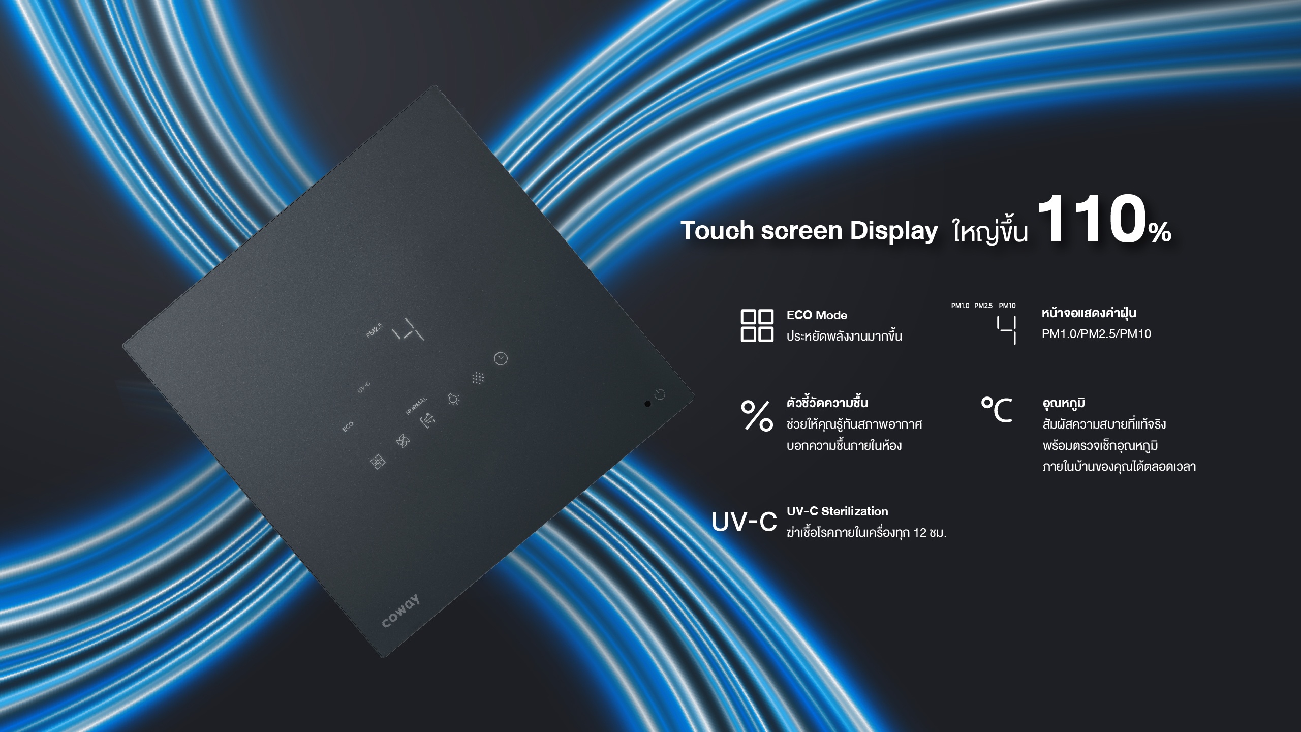 หน้าจอระบบสัมผัส (Touch Screen) พร้อมแสดงสถานะค่าฝุ่นละอองและแก๊ส (PM 2.5 / PM 1.0) แบบเรียลไทม์