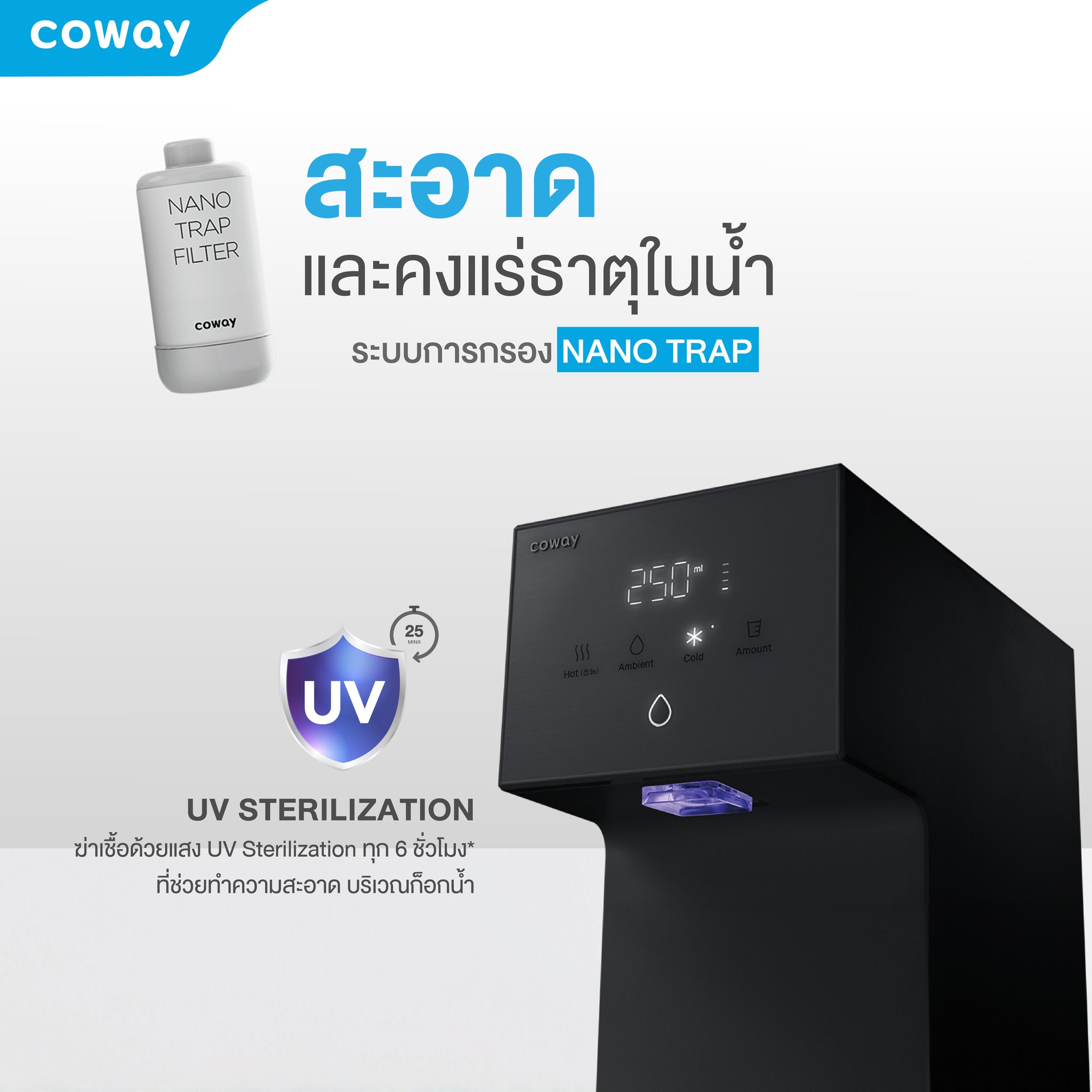 จ่ายน้ำร้อนและน้ำร้อนโดยรอบได้ไม่จำกัดทันที ด้วยถังน้ำเย็นขนาด 1 ลิตรโดยเฉพาะ รักษาความชุ่มชื้นด้วยน้ำกรอง Coway NanotrapTM ซึ่งกำจัด Murine Norovirus ออกจากน้ำประปาได้มากถึง 99.999%* ได้อย่างมีประสิทธิภาพ โดยยังคงรักษาระดับน้ำที่ปล่อยออกมาให้น้อยที่สุด